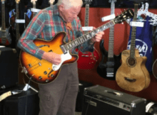 The atmosphere transforms, the guitar store now a temporary concert hall where the audience is unexpectedly treated to a performance by a seasoned musician. The grandpa’s music becomes