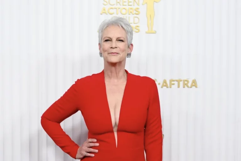 Halloween’s star, Jamie Lee Curtis, made a stunning appearance on the red carpet in a plunging navy blue dress that beautifully showcased her figure. The dress featured a