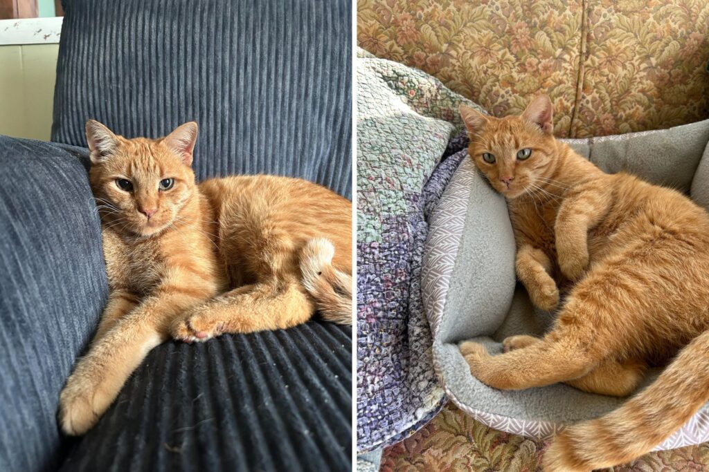 The friendship progressed further, and the orange cat moved to the cat bed she had gotten for him and left in her entryway. He eventually ventured inside while she was there and became “pretty comfortable right away.” Before long, he would cry at the door to be let in; the rest was history.