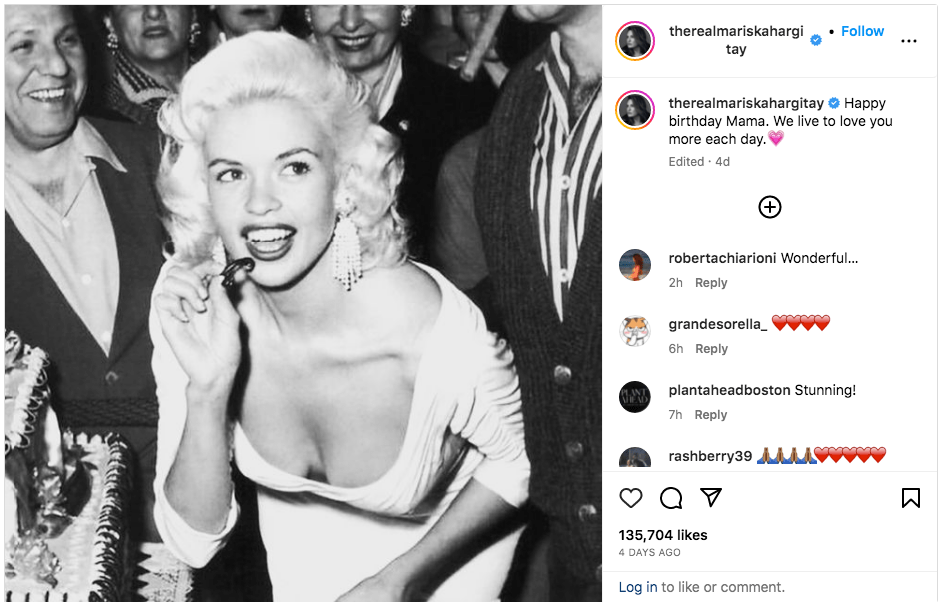 On what would have been Jayne’s birthday, Mariska sends her heartfelt wishes to her beloved mother in the heavens.