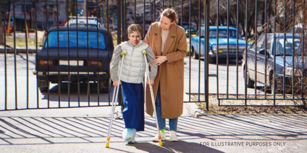 Woman helping boy on crutches. | Source: Getty Images